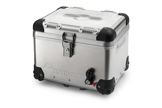 Objemný hliníkový kufr pro převoz nákladu na motorce.